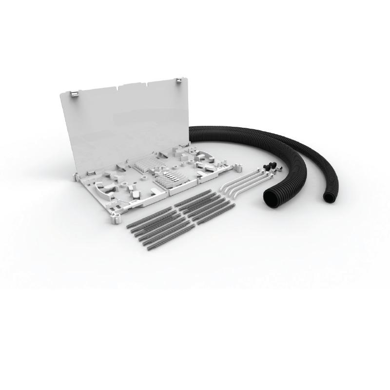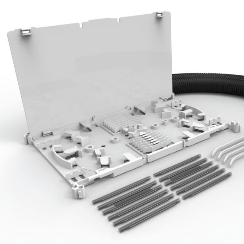 Fabricada em plástico resistente, a bandeja tem capacidade para acomodar com segurança até 12 fusões (12F). Seu design interno é otimizado para garantir que as fibras mantenham o raio de curvatura mínimo necessário, evitando perdas de sinal e danos mecânicos às fibras.