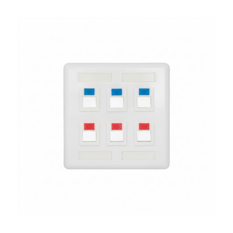 Produto desenvolvido para utilização em conjunto com caixas embutidas em parede, nas dimensões de 4x4", em instalações de infraestrutura de redes de voz, vídeo e dados, compatível com conectores RJ-45 fêmea padrão “keystone”.