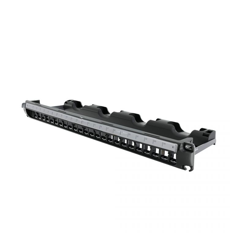 Patch panel descarregado de 1U com 24 portas, compatível com conectores fêmea blindados e não blindados das categorias CAT.5E, CAT.6 e CAT.6A.