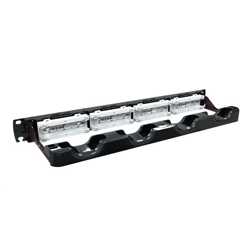 Patch panel modular para cabeamento estruturado Cat.5E, ideal para tráfego de voz, dados e imagens em salas de telecomunicações e sistemas horizontais, conforme norma ANSI/TIA/EIA-568C.2.