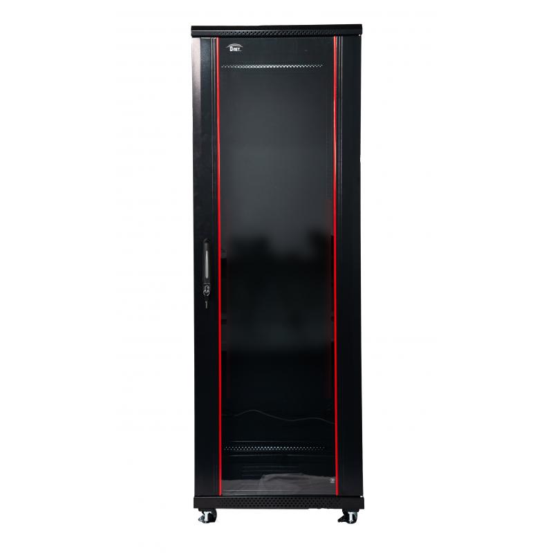 A porta frontal de vidro temperado proporciona fácil visualização dos equipamentos internos. Sua estrutura desmontável facilita o transporte e a montagem em locais de difícil acesso. Este modelo é fornecido sem guias, permitindo flexibilidade na configuração interna.
